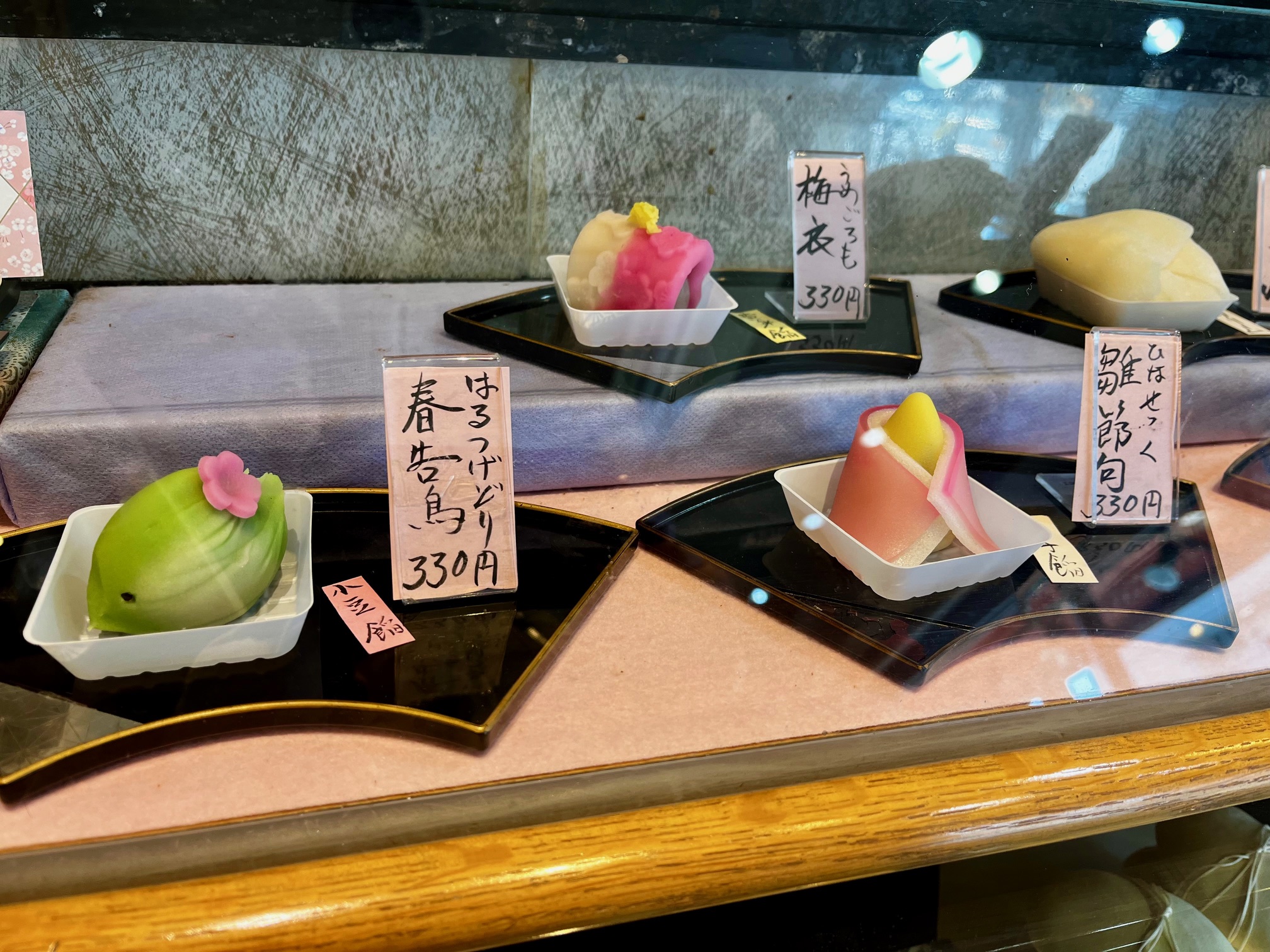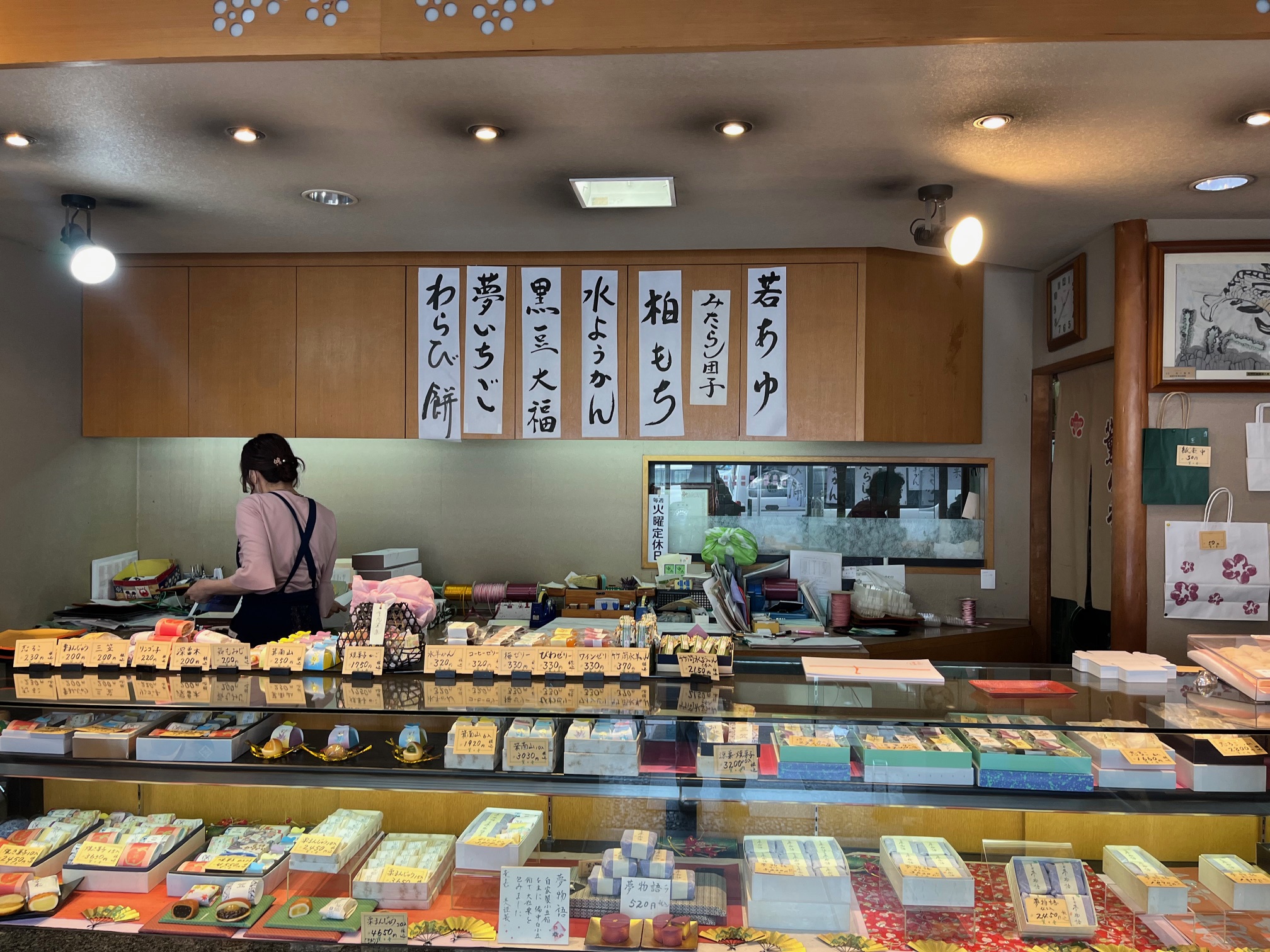 和菓子一筋70年。店内にはずらりと並ぶお菓子の数々。季節ごとにデザインが異なる美しい生菓子、お土産に嬉しい焼き菓子、カステラや、御餅、カラフルなゼリーなど。