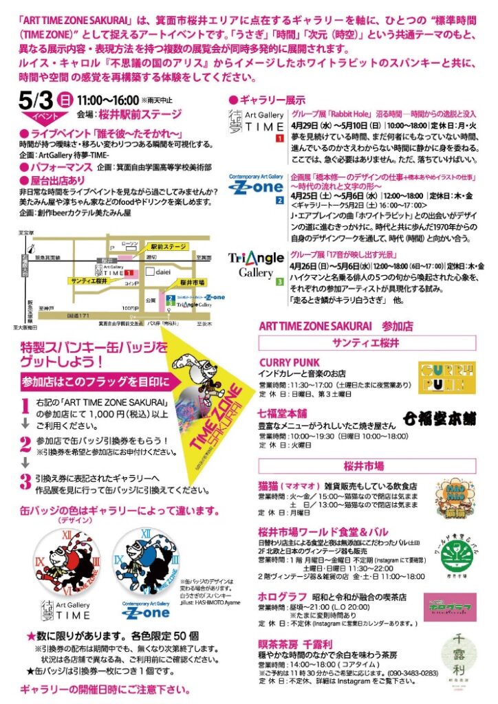 箕面市桜井エリアに点在するギャラリーで、「うさぎ」「次元(時空)」という共通テーマのもと、異なる展示内容・表現方法を持つ複数の展覧会が同時多発的に展開されます。